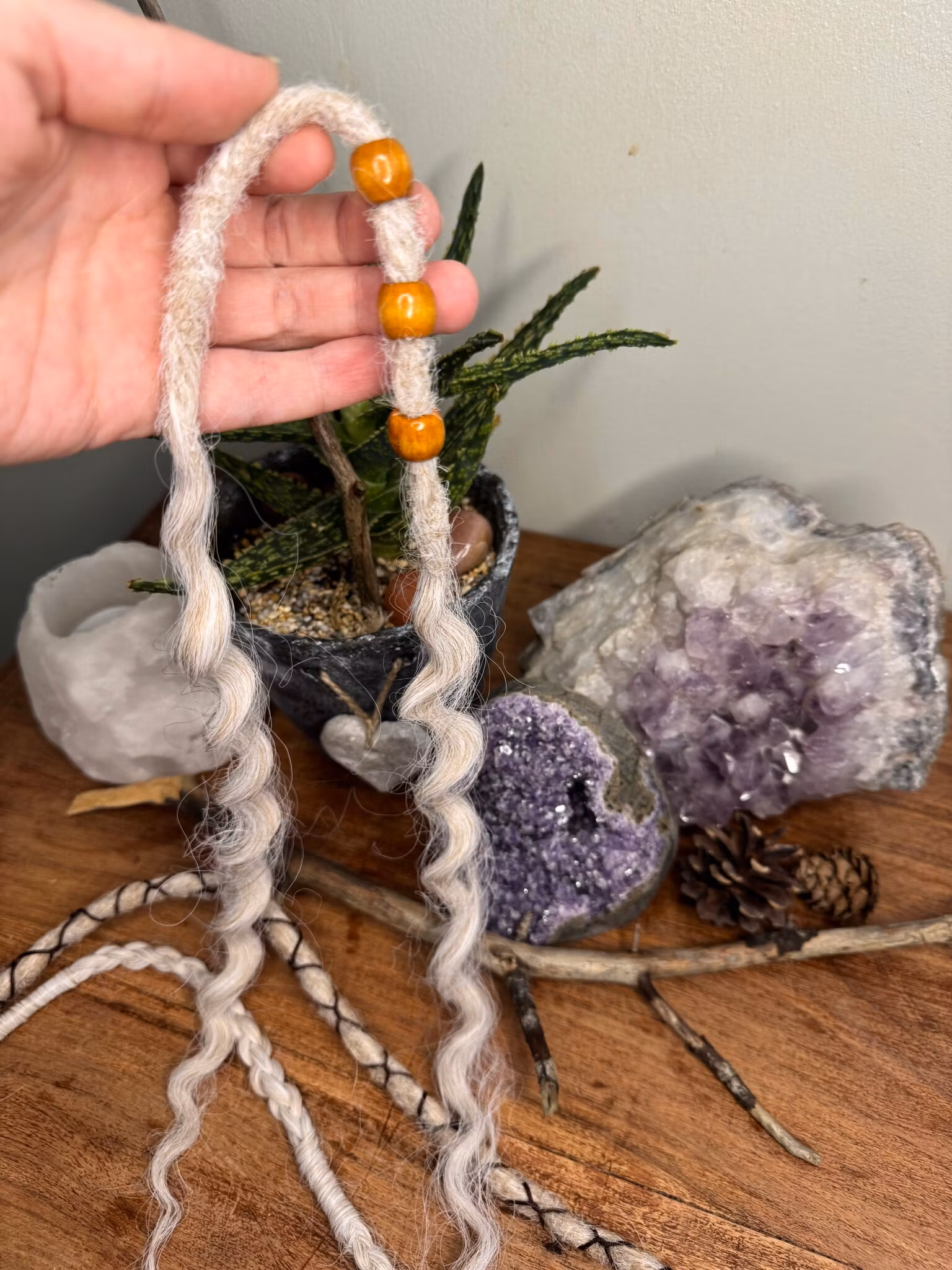 Dreadsmycke i gul/brunmålat trä. Ett superenkelt sätt att piffa till dina dreads eller varför inte använda dom för att gömma ojämnheter i dreadlocksen!Säljes st