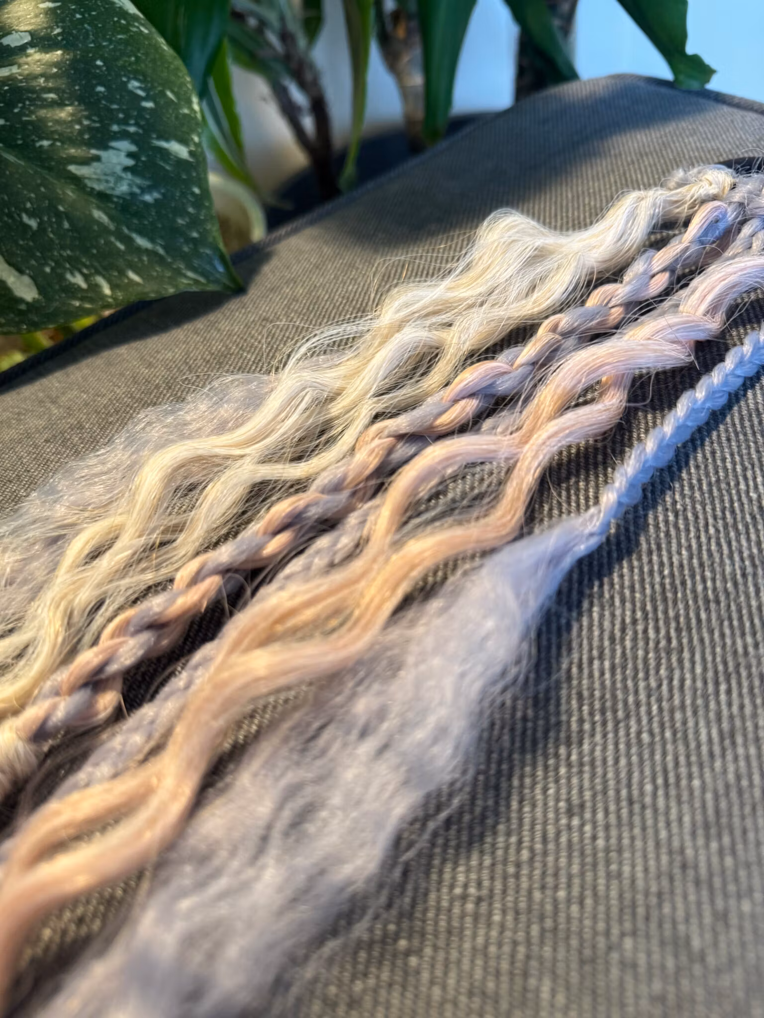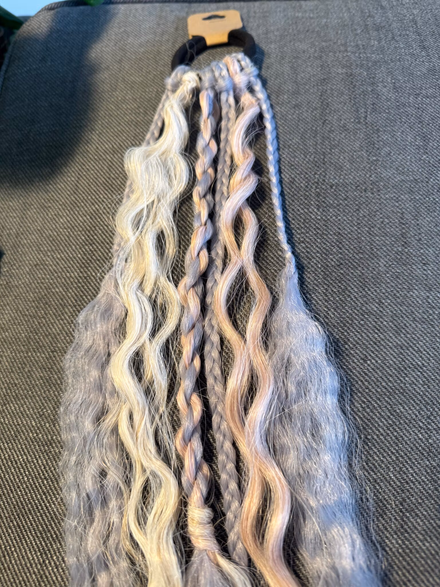 Ca 45-50 cm långa flätor, fästa på en mycket elastisk dreadsnodd som når runt de all flesta hårsvall.