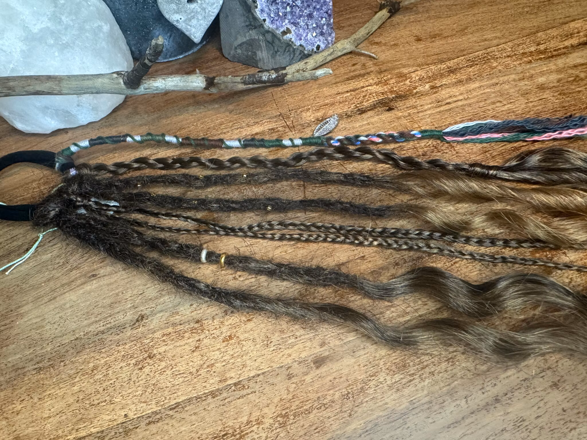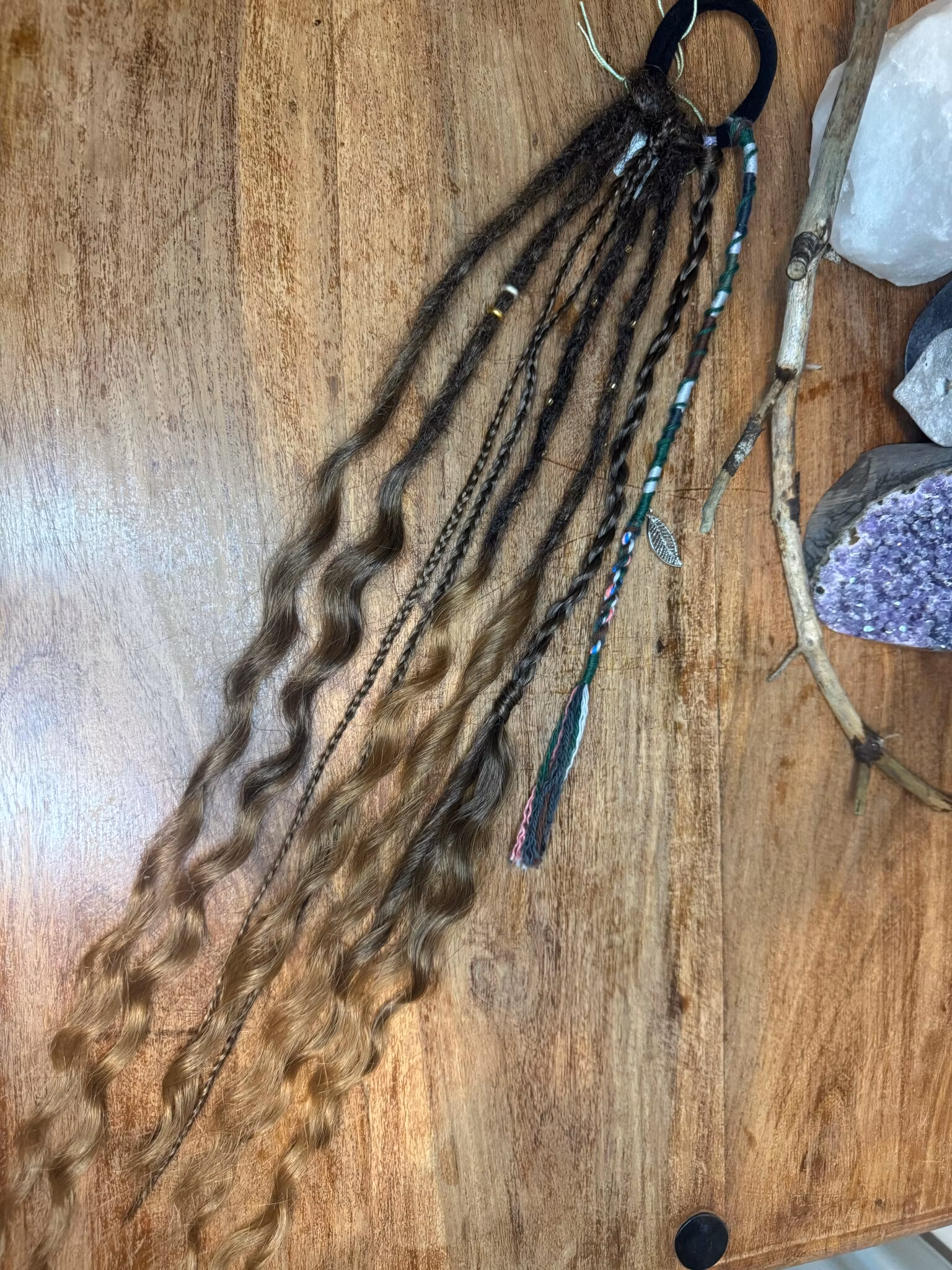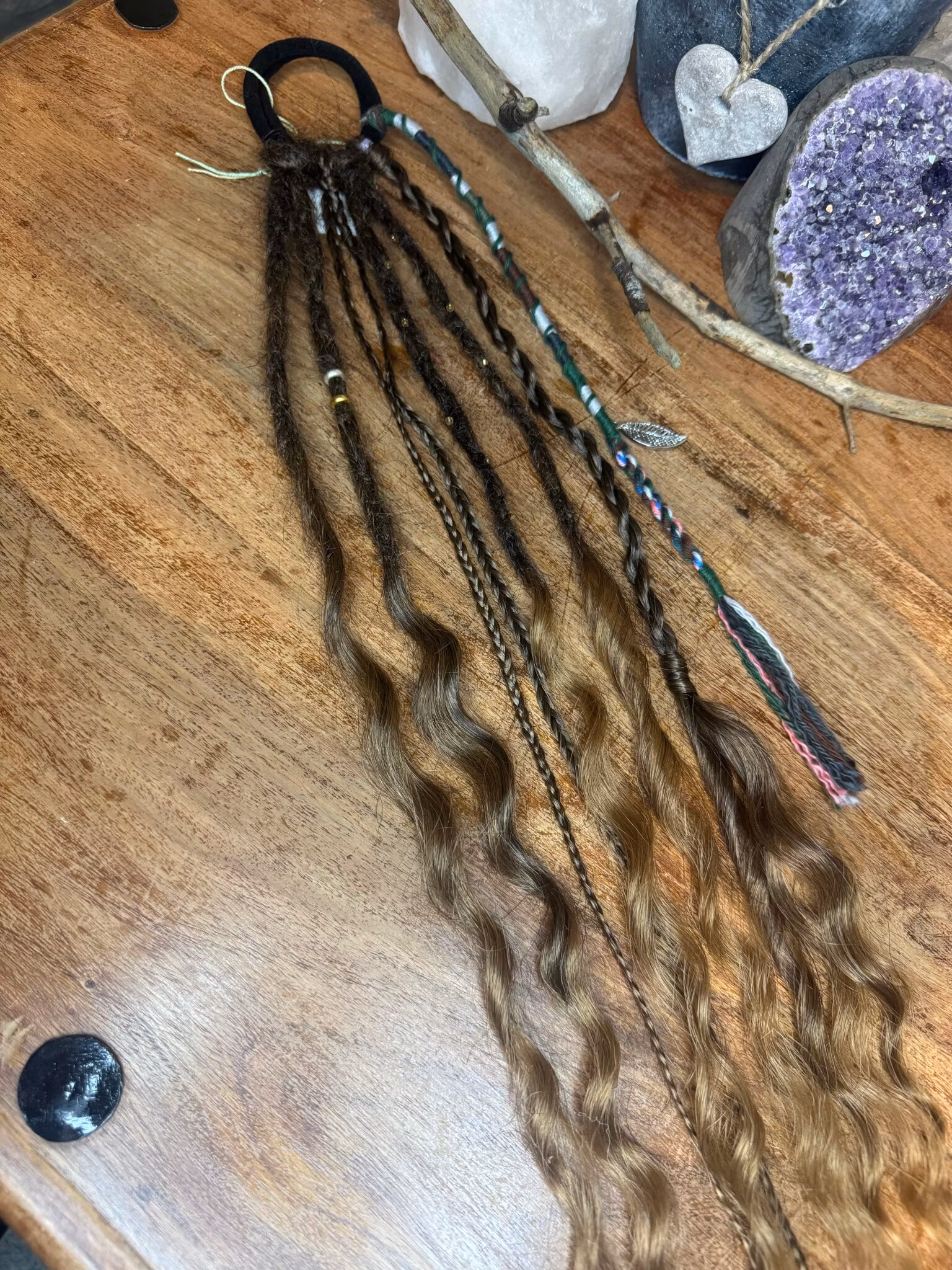 Accent det tillverkat i salongen.Färgerna går i brunt med silverfärgade detaljer.Tillverkat av syntetiskt hår.