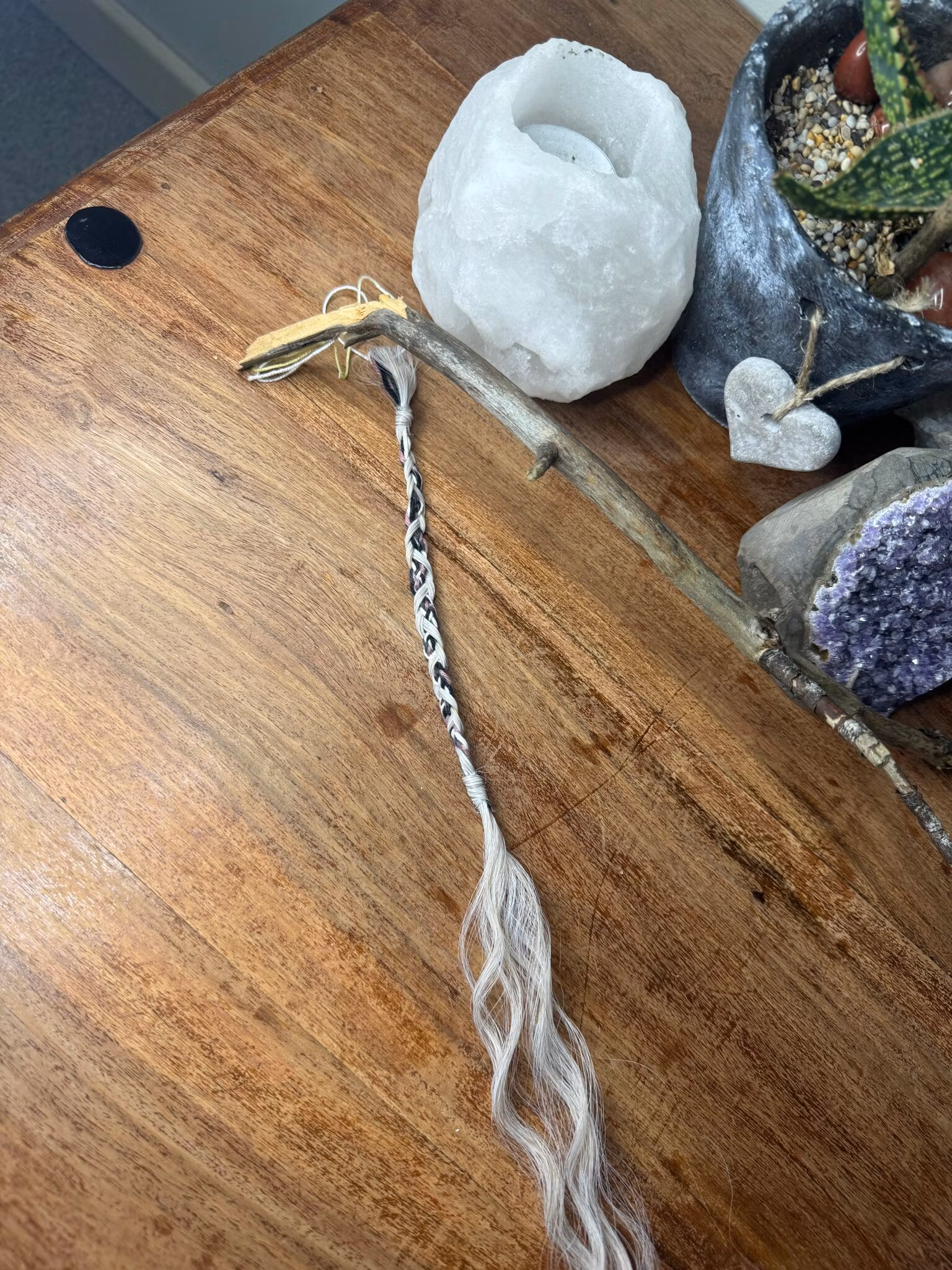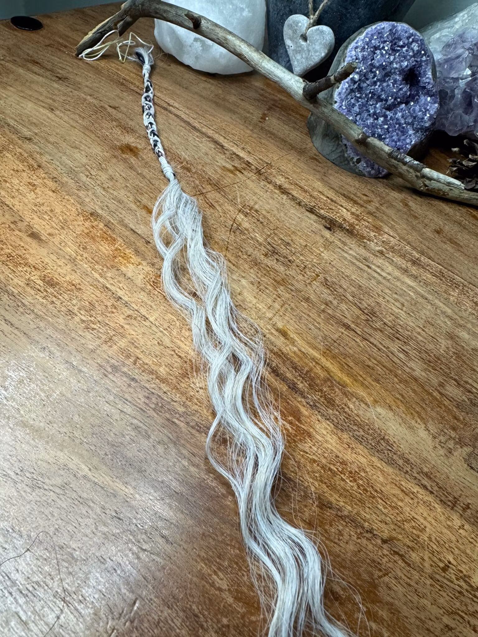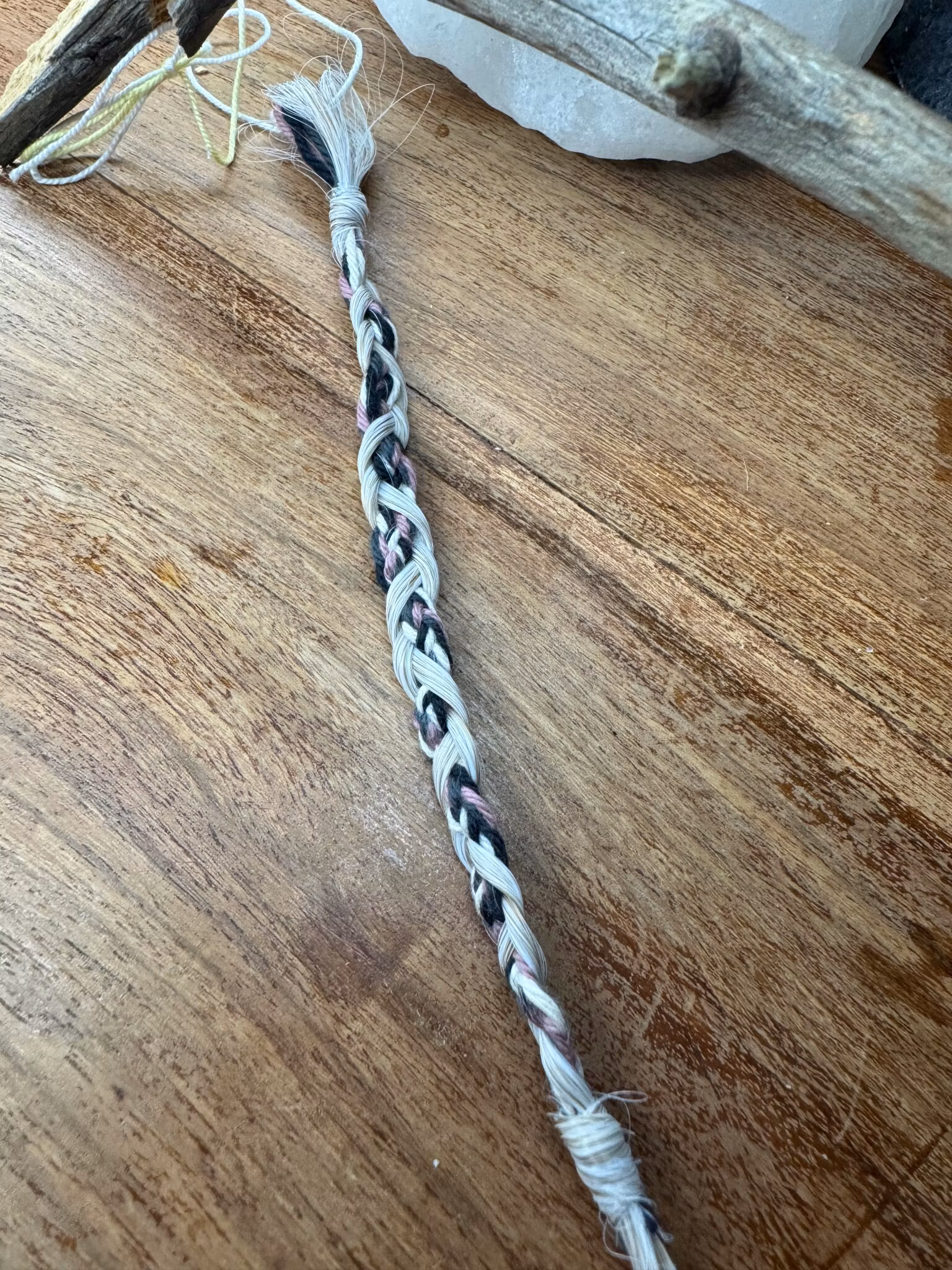 Fläta av vitt syntetiskt wow-hair och bomullsgarner i svart, grått och rosa.Flätan på bild är den du köper! Finns bara en!