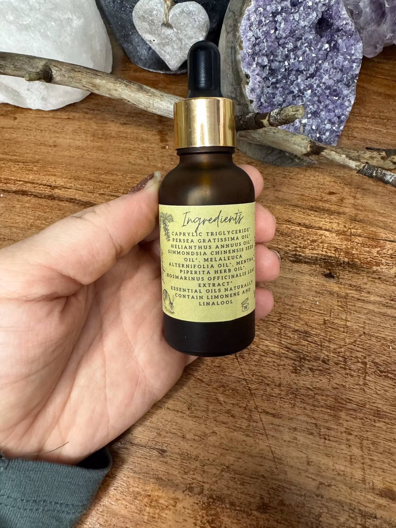 Caprylic triglyceride* Persea gratissima oil* Helianthus annuus oil* Simmondsia chinensis seed oil*, melaleuca alternifolia oil*, mentha piperita herb oil*, Rosmarinus officinalis leaf extract*