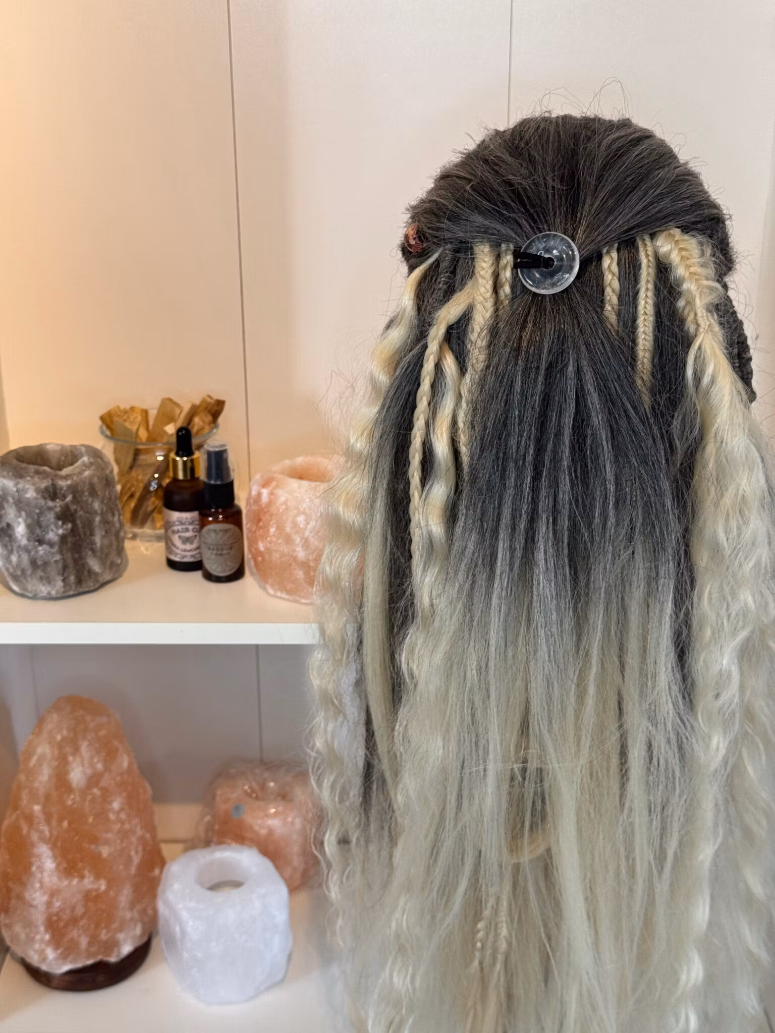 Hårsnodd med en kristall i klar bergskristallDu använder snodden genom att trä den runt ditt hår och stänga den som “en knapp” runt håret.Finns instruktions vid
