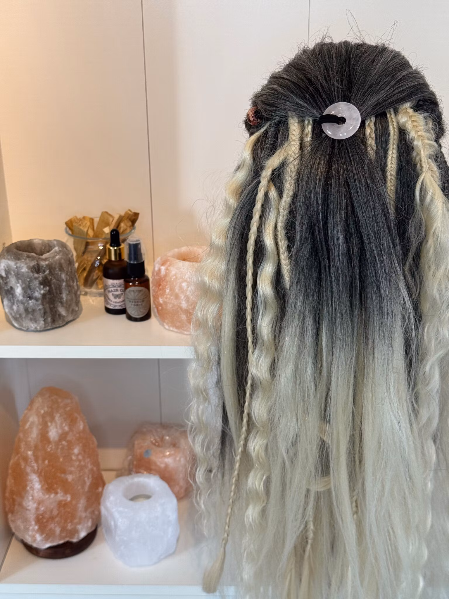 Hårsnodd med en kristall i RosenkvartsDu använder snodden genom att trä den runt ditt hår och stänga den som “en knapp” runt håret.Finns instruktions video på v