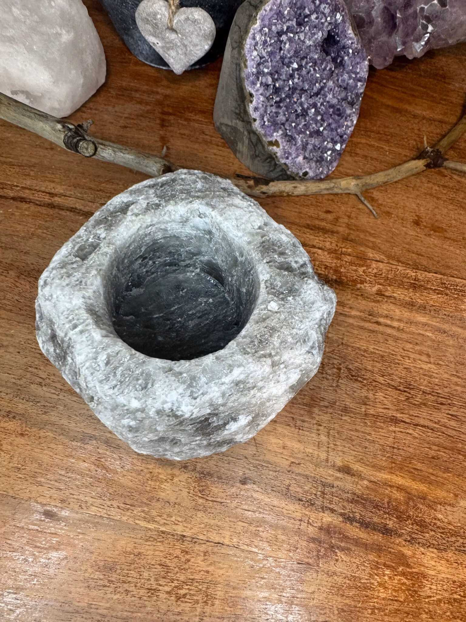 Vacker ljuslykta i naturlig svart/grå saltkristall från Himalaya. Lyktorna kommer från naturen och därför är var och en av dem helt unika. Naturliga färgskiftni