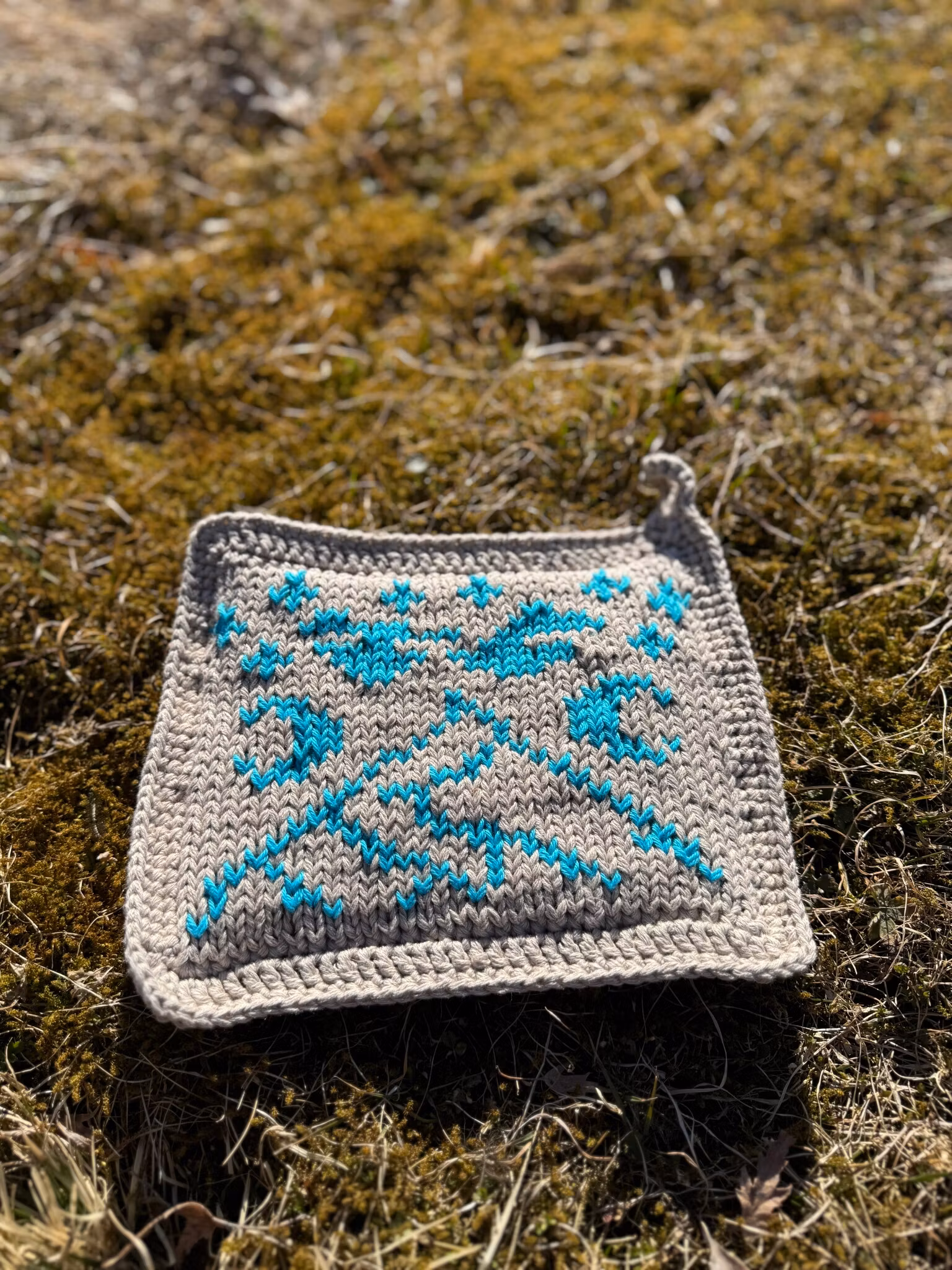 Handstickad grytlapp i 100% OEKO tex certifierad bomull och lin. Tål maskintvätt på 40 grader, sträckes i vått tillstånd. Stickat i dubbelt garn för att bli ext