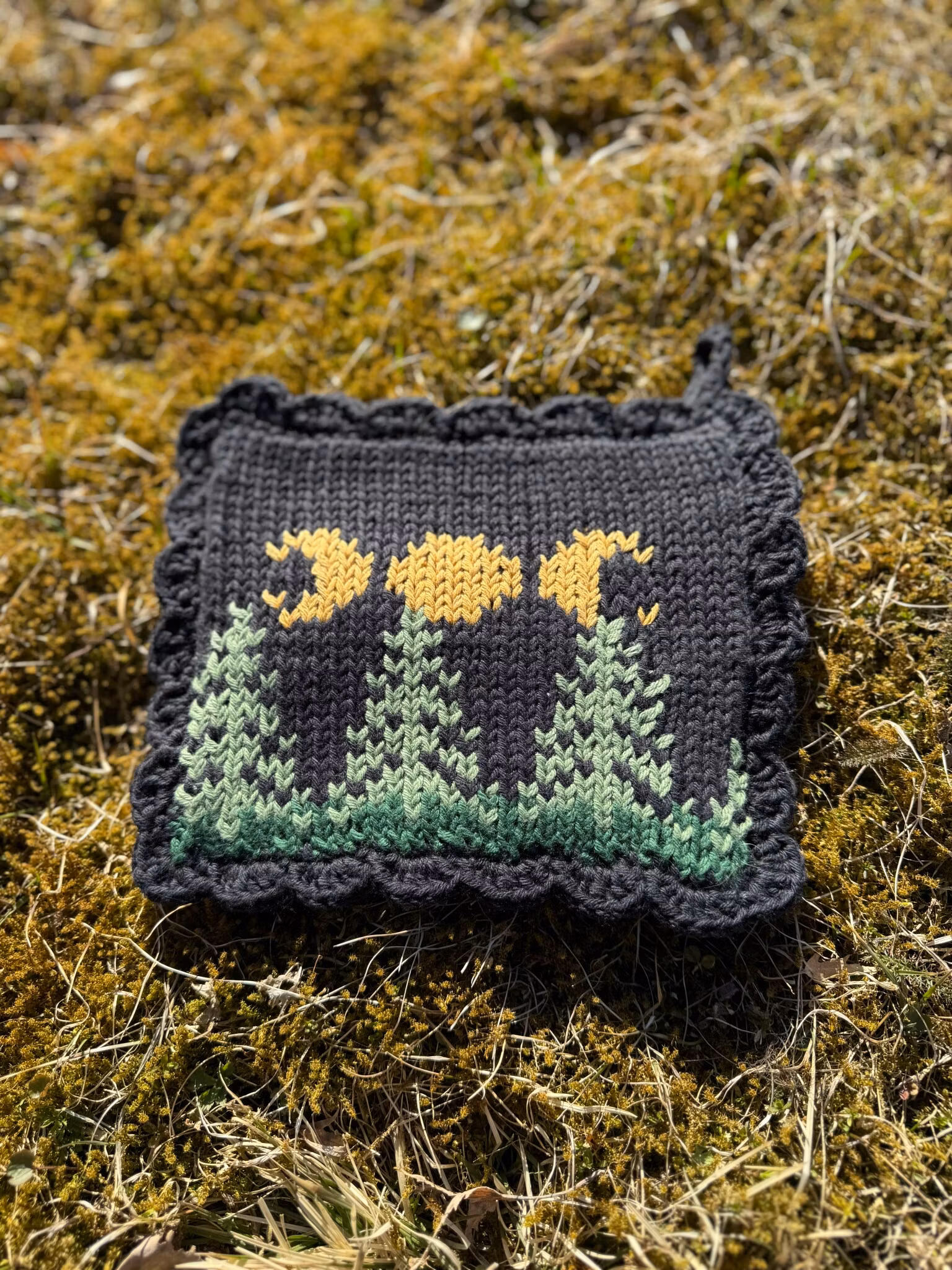 Handstickad grytlapp i 100% OEKO tex certifierad bomull. Tål maskintvätt på 40 grader, sträckes i vått tillstånd. Stickat i dubbelt garn för att bli extra värmetålig.