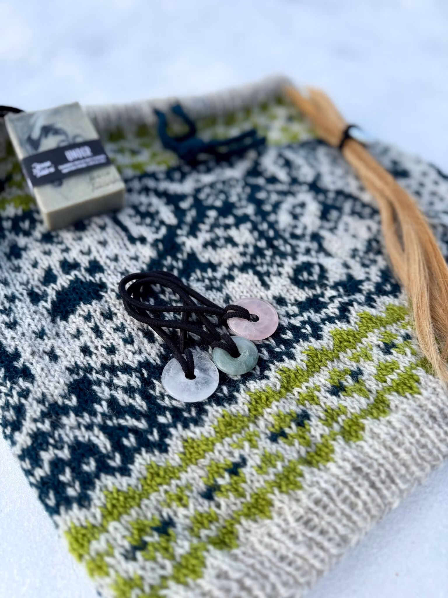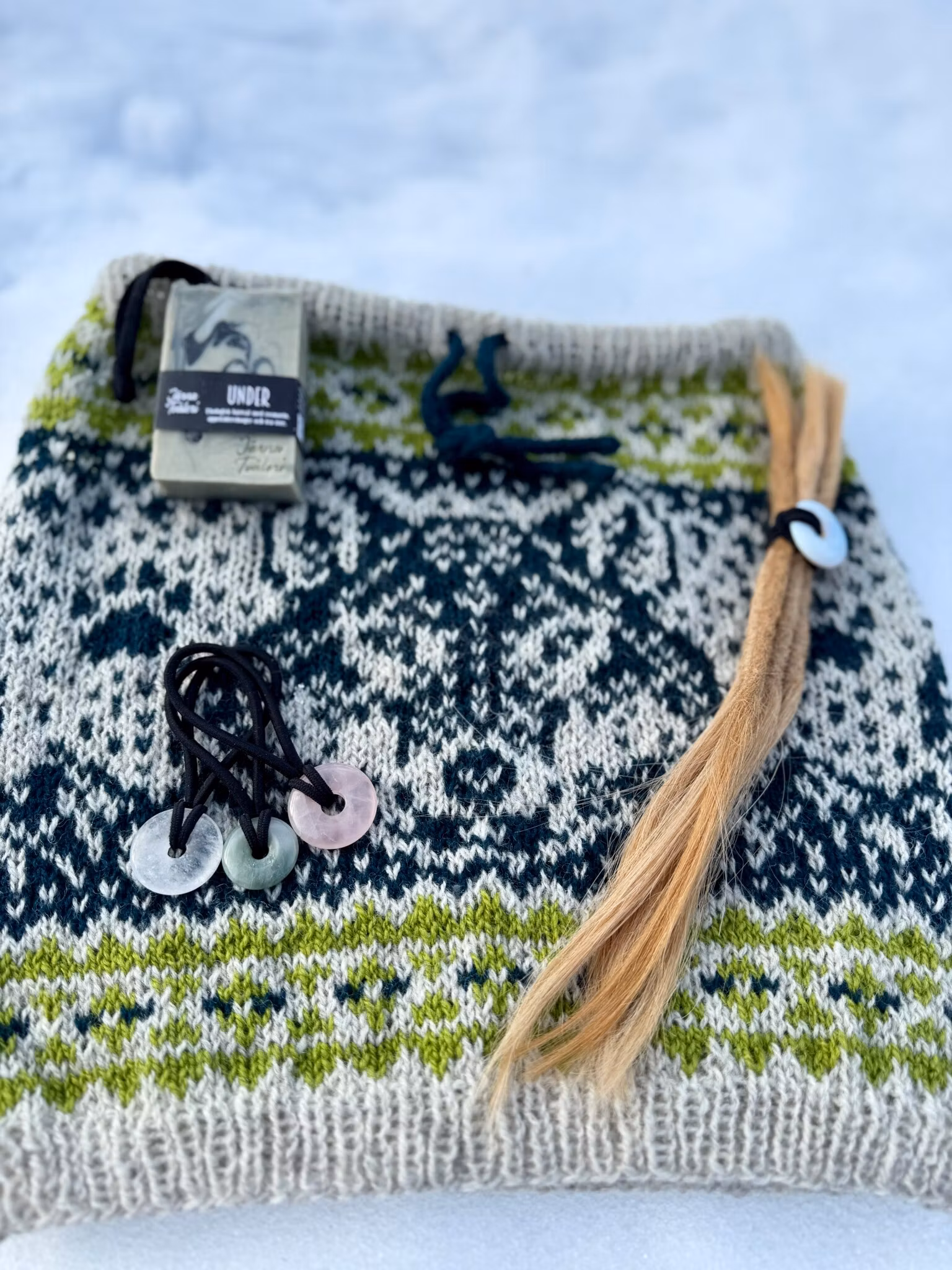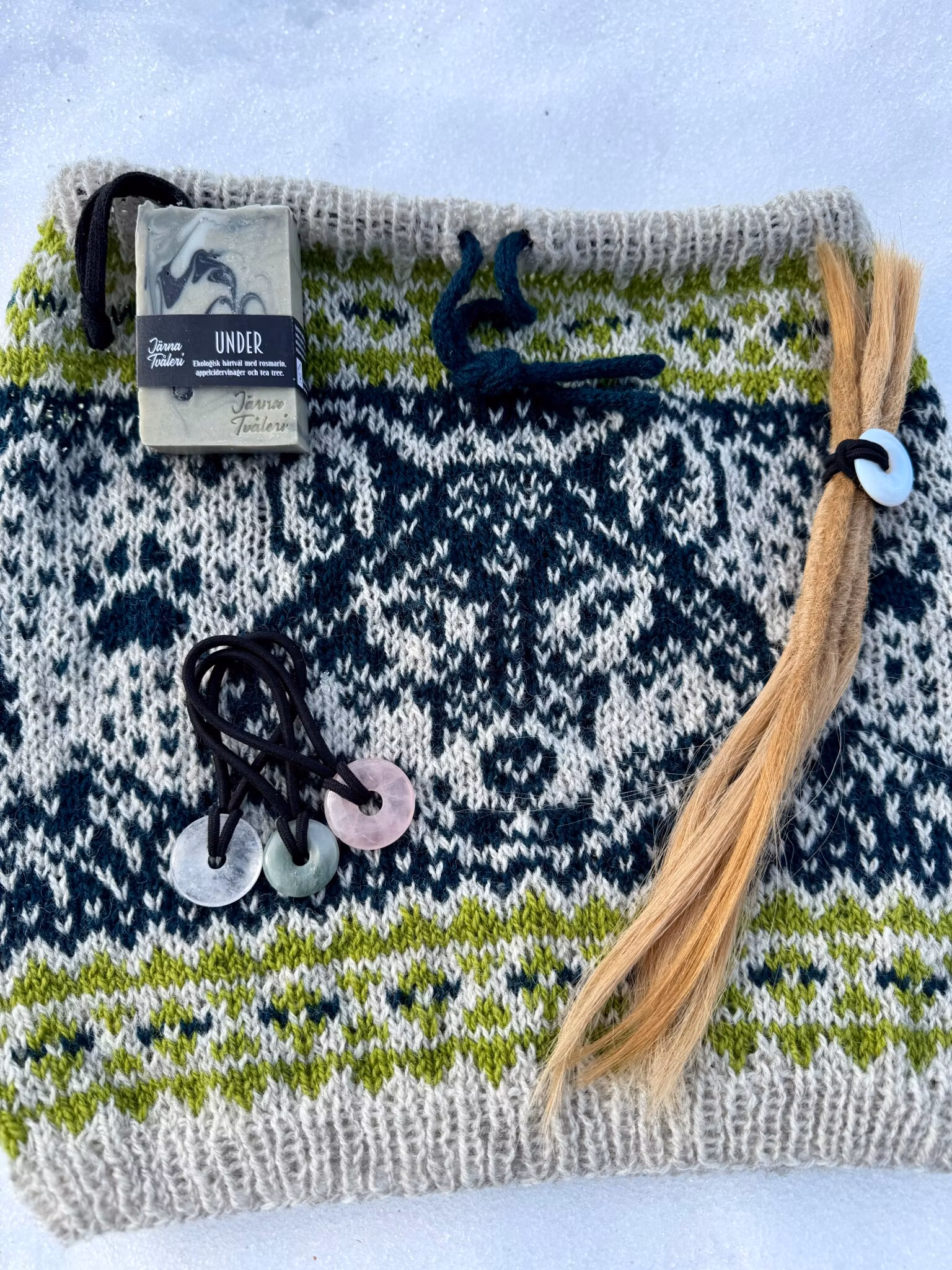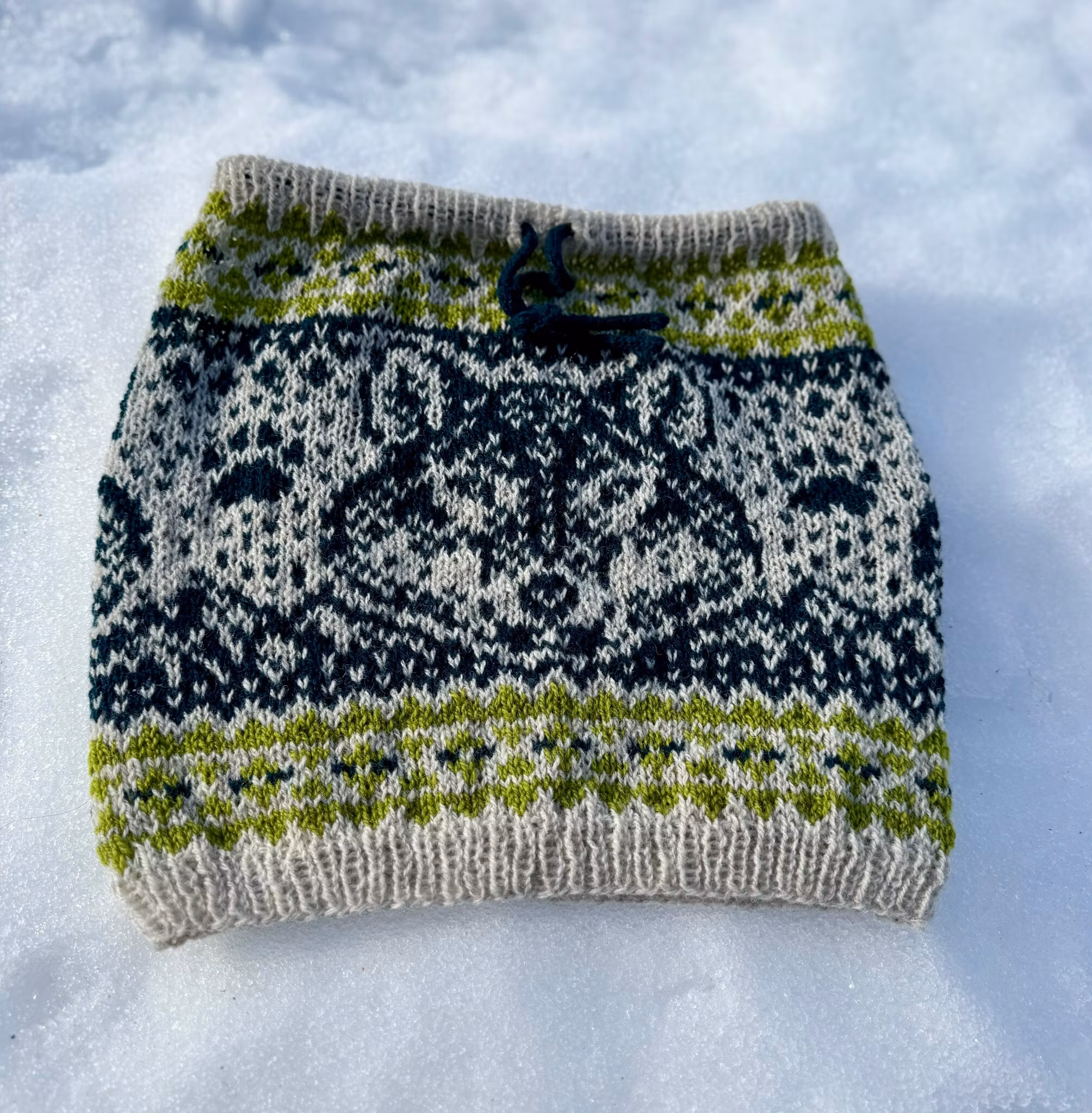 Handstickad halstub (buff) med snörning i halsen, perfekt för att kunna stänga ute kyliga vindar.Stickad i Rauma finull (100% norsk ull) i Jämtlandsfärgerna.Tvä